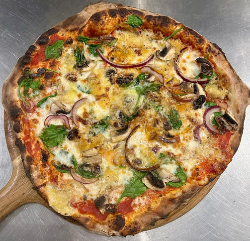 Crumbled blue cheese, mushrooms, leafy spinach and red onions