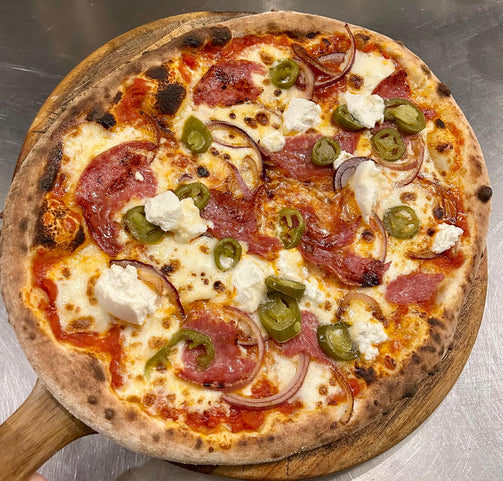 Salami, red onion, ricotta, jalapeno peppers and hot honey drizzle